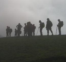 After Mt William we continued along a saddle of rolling farmland & sheep to Puketutu trig where several communication towers & masts are situated. On our way there, the fog finally rolled in over us & briefly we could hardly see in front. See my pic of a group silhouetted on the ridge. All the while, Val was having a great time foraging for mushrooms & ended up with several bags full. Then once the fog had passed there was clear blue sky again. Puketutu is 379m, just a few metres higher than Mt William & the views from there are impressive. Can see the Kaimai Ranges in the distance. The ground, quite soft, not too muddy, just had to be careful on descents & also watch out for sheep & cattle poo.